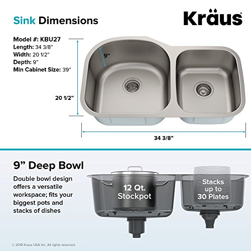Kraus undermount stainless steel sinks are designed with your kitchen in mind. Constructed from premium 16 or 18 gauge T-304 stainless steel for maximum durability, the extra-deep basins accommodate large dishes with ease. All Kraus kitchen sinks are equipped with top-level soundproofing, including thick rubber dampening pads. Each sink is additionally treated with protective Stone Guard coating, which reduces condensation and further dampens sound. The corrosion-resistant surface is further protected from rust and oxidation by a meticulous finishing process. Commercial-grade satin finish and gently rounded corners make maintenance as simple as wiping the surface with a damp cloth. Equally at home in a transitional and modern kitchen, this double bowl sink provides a lifetime of functionality. The 60/40 split basin adds flexibility for a variety of kitchen tasks. For added convenience, the sink comes with dual stainless steel bottom grids, a basket strainer, and a drain assembly, included free with purchase. Each bottom grid is cushioned by soft protective bumpers to prevent scratching. For easy installation, all mounting hardware is provided. Experience Kraus Quality and bring your best kitchen ideas to life.