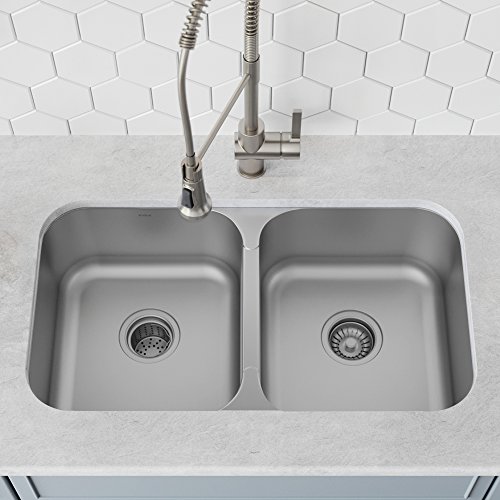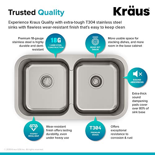 Kraus undermount stainless steel sinks are designed with your kitchen in mind. Constructed from premium 16 or 18 gauge T-304 stainless steel for maximum durability, the extra-deep basins accommodate large dishes with ease. All Kraus kitchen sinks are equipped with top-level soundproofing, including thick rubber dampening pads. Each sink is additionally treated with protective Stone Guard coating, which reduces condensation and further dampens sound. The corrosion-resistant surface is further protected from rust and oxidation by a meticulous finishing process. Commercial-grade satin finish and gently rounded corners make maintenance as simple as wiping the surface with a damp cloth. Equally at home in a transitional and modern kitchen, this double bowl sink provides a lifetime of functionality. The 50/50 split basin adds flexibility for a variety of kitchen tasks. For added convenience, the sink comes with dual stainless steel bottom grids, a basket strainer, and a drain assembly, included free with purchase. Each bottom grid is cushioned by soft protective bumpers to prevent scratching. For easy installation, all mounting hardware is provided. Experience Kraus Quality and bring your best kitchen ideas to life.
