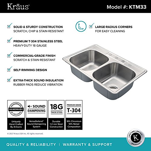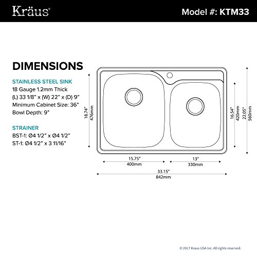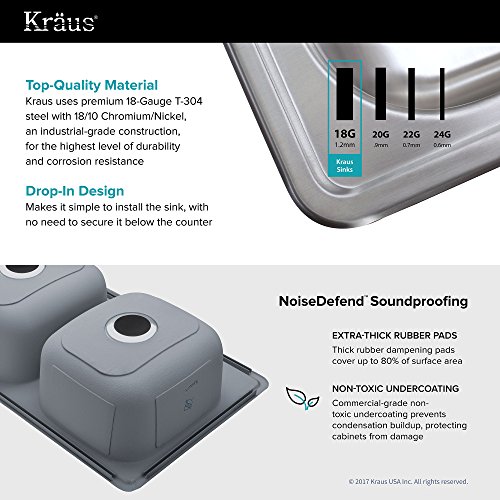 Kraus top mount stainless steel sinks are at home in any kitchen. Constructed from high quality stainless steel for maximum durability, the deep basins accommodate large dishes with ease. All Kraus kitchen sinks are equipped with top-level soundproofing, including thick rubber dampening pads. Each sink is additionally treated with protective Stone Guard coating, which reduces condensation and further dampens sound. The corrosion-resistant surface is further protected from rust and oxidation by a meticulous finishing process. Commercial-grade satin finish and rounded corners make maintenance as simple as wiping the surface with a damp cloth. This double bowl sink is easily retrofitted, making it ideal for your remodeling projects. The 50/50 split basin adds flexibility for a variety of tasks. For added convenience, a basket strainer, drain assembly, and complimentary towel are included free with purchase. Constructed from premium stainless steel, the top-quality basket strainer assembly creates a tight seal to prevent food and debris from clogging the drainpipe. For easy installation, all mounting hardware is provided. Experience Kraus Quality and bring your best kitchen ideas to life. Benefits & Features Non-Porous Corrosion-Resistant Surface Commercial-Grade Satin Finish Scratch and Stain-Resistant Deep Double Bowl Design Standard 3. 5″ Drain Opening Gently Rounded Corners for Easy Maintenance All Mounting Hardware Included Limited Lifetime Certified and Listed by UPC, cUPC, IPC, ANSI, IAPMO, and SCC installation type: Top mount sink cutout template: included minimum cabinet size: 36 in basin split: 50/50 in sink length: 33 in sink width: 22 in sink depth: 9 in drain opening: 3. 5 in drain position: Center number of faucet holes: 4 . this versatile sink can be mounted into kitchen countertops made from any material, from solid surface to laminate
