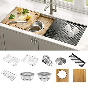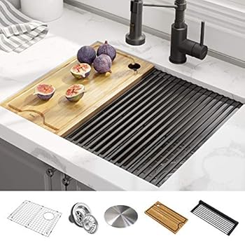 Maintaining a classic look that will complement any kitchen with the beauty and functionality of large, deep bowls with classic rounded corners, the parmi series is still streamlined enough to be the centerpiece of any counter top. 16 gauge premium 304 grade Stainless Steel (18/10 chromium/nickel). luxurious satin finish – easy to clean and long-lasting. Heavy duty sound guard padding and undercoating. Exterior dimensions: 15 3/4″ x 18″. interior dimensions: 13 3/4″ x 16″. bowl depth: 8″. standard 3.5″ drain opening will fit any garbage disposal unit.. included in box: sink, cut-out template, mounting brackets, rinse grid, basket strainer. Upc and cupc certified by iapmo to meet us and Canada Plumbing standards including ANSI and CSA. Ruvati limited lifetime warranty.