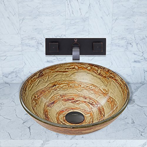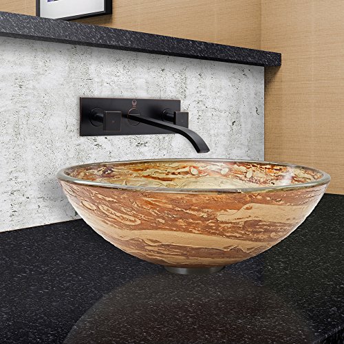 The VIGO Mocha Swirl Glass Vessel Sink and Wall Mount Faucet Set is certain to be a tasteful elegance in your home with creamy coffee colors, sure to awake your senses. Handcrafted with possible unique and slight color variations so no two sinks are identical. Each sink is a dynamic work of art that complements any style bathroom. With its scratch resistant glass and non-porous surface fading and discoloration is a thing of the past. The VIGO faucet features dual lever water and temperature control. This faucet is created using top quality components, including a high quality ceramic disc cartridge means a drip-free, long lasting faucet. All VIGO finishes resist corrosion and tarnishing, exceeding industry durability standards. Includes solid brass pop up drain and mounting ring in matching finish.